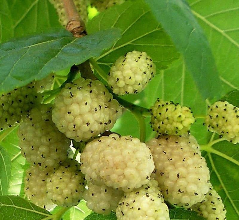 Белая шелковица сорта Медовый – один из востребованных самоплодных и зимостойких сортов. Этот саженец может вырасти в дерево средней высоты, достигающее 10-15 метров, но чаще всего его формируют в виде более компактного куста. Цветет в мае, а плоды появляются довольно рано – уже в июне можно наслаждаться сочными и сладкими белыми ягодами, которые продолжают созревать до июля. Ягоды имеют длину около 3 см и диаметр 1 см. Плодоношение начинается на четвертый год и отличается обильностью.